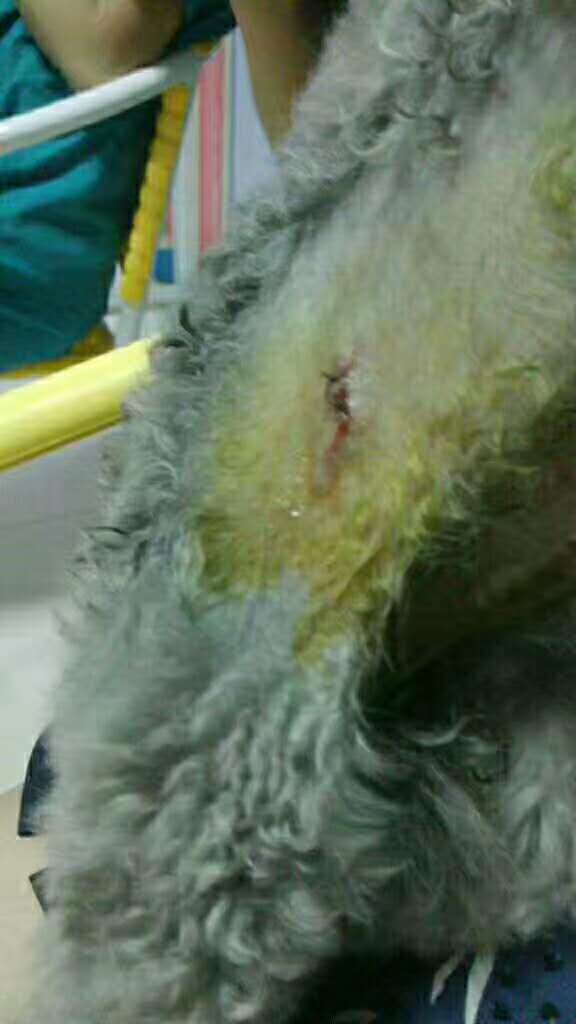 吉米,灰泰迪,腹外側(cè)被大狗咬傷;福子,紅棕泰迪,耳邊緣被狗輕微咬穿。一晚接兩被狗咬傷,注意:晚上遛狗請(qǐng)大家盡量牽好牽引繩,避免意外發(fā)生。